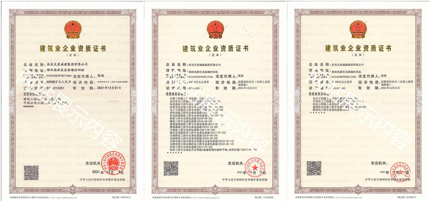 浩龍?zhí)煨浅墙瘓F(tuán)有限公司,2007年成立于“李白故鄉(xiāng)、中國科技城”—四川省綿陽市,企業(yè)注冊資本金5.0008億元。公司共有27項(xiàng)建筑業(yè)企業(yè)資質(zhì),其中國家一級資質(zhì)11項(xiàng),二級資質(zhì)10項(xiàng),三級資質(zhì)5項(xiàng),特種資質(zhì)不分等級1項(xiàng),類別涵蓋建筑、市政、水利、機(jī)電、隧道、起重設(shè)備安裝等基礎(chǔ)及未來發(fā)展重點(diǎn)專業(yè)。公司...